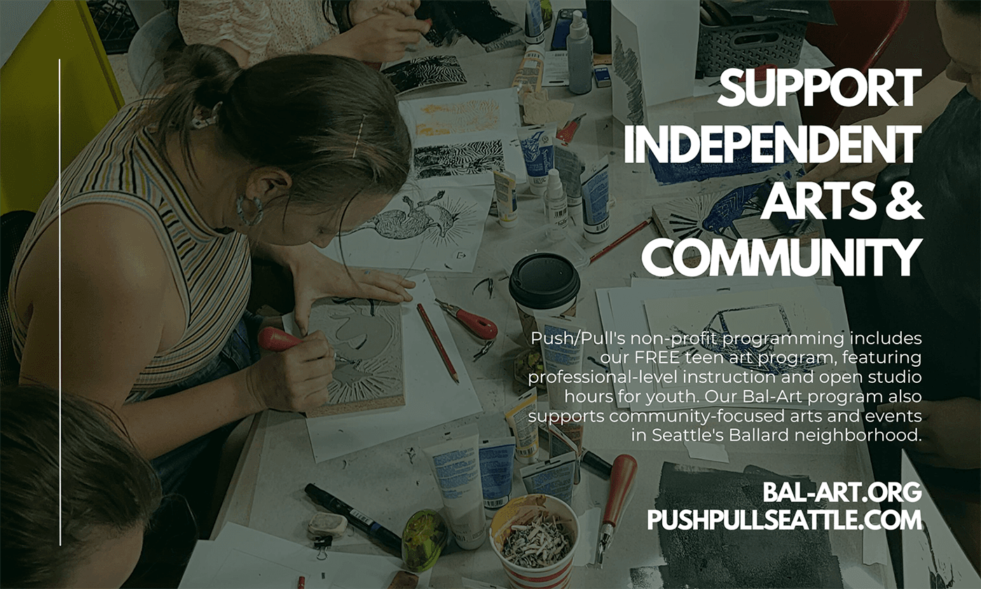 Push/Pull's non-profit programming includes our free teen art program, featuring professional-level instruction and open studio hours for youth. Push/Pull is also the parent company of Bal-Art, a not-for-profit, community-focused arts and events program in Ballard (more info at bal-art.org).