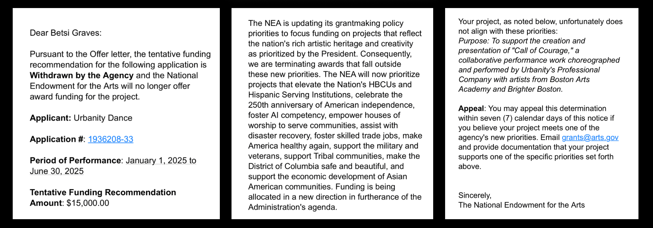 Urbanity Dance received notification from the government on May 3, 2025 regarding the revocation of a $15,000 grant from the National Endowment for the Arts (NEA) that Urbanity had been awarded in Fall of 2024 in order to produce a collaborative dance experience with Boston Arts Academy titled, Call of Courage.