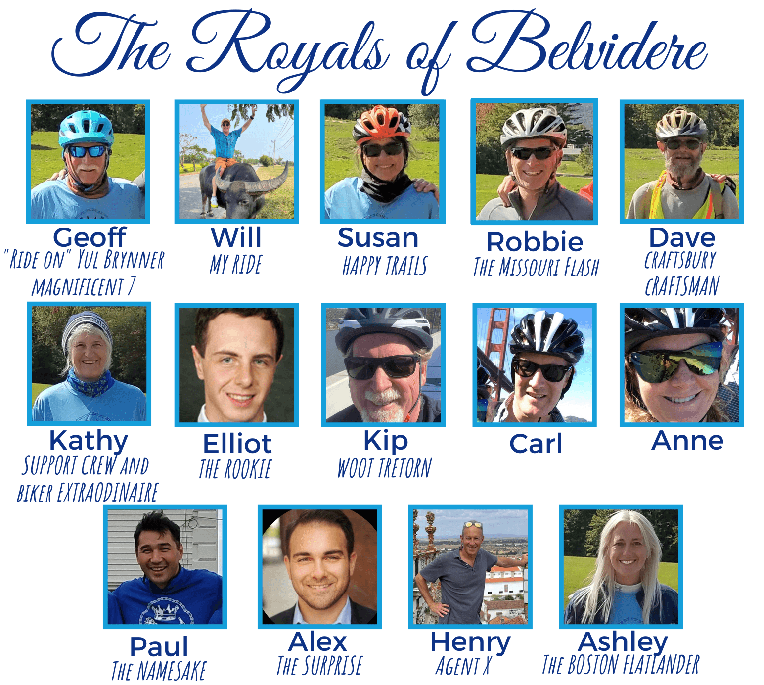 My inspiration for the event remains the sight of the entire 1999 baseball squad, huddled against a cold April drizzle, waiting to attend the nearby funeral of teammate Paul Roy’s father, who had died of ALS. It remains an honor to play on the ALSONE team with Paul. I use play in the sense of Frost’s line, “the work is play for mortal stakes,” since every ride could be my last. Meanwhile, here’s to LIFE, and to easing the lives of those afflicted with ALS, a cause I hope you will consider supporting. One final note: a fortnight after Nick Potter crossed the bar, a former student and friend Kelsey Libner, did so also. A perennial sponsor of ALS, in his last email to me Kelsey extolled the 2024 wrap-up: “The map is extraordinary! It works well as a PDF because I can zoom in. It gives me a feeling of following the ride. Love the mix of map, drawings and photos. And a stats panel!” Kelsey’s enthusiasm for the -ROYALS went far beyond words, as he left a substantial gift to ALSONE. I will honor Kelsey by placing his name of the front of my helmet and by dedicating the 2025 event to him.