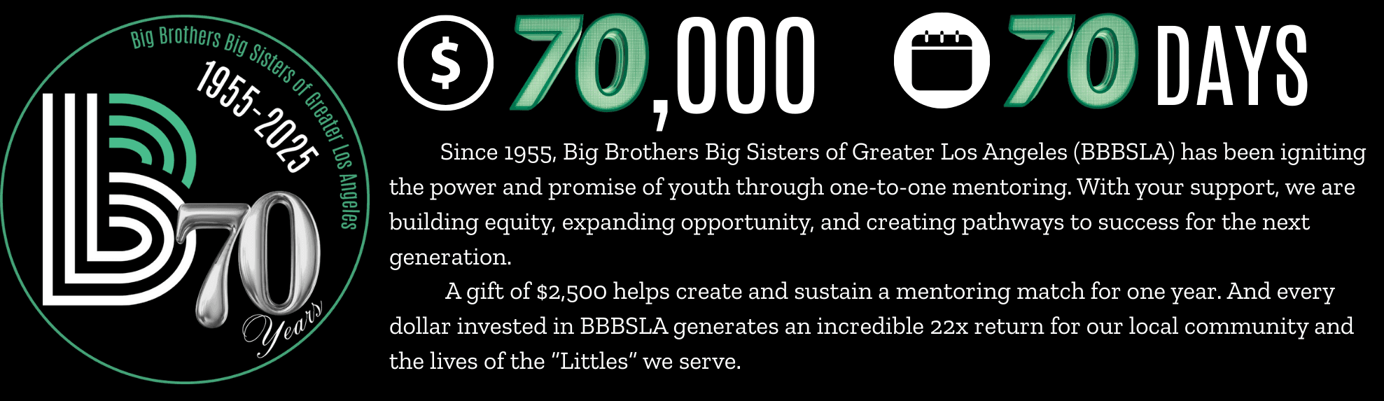 Double your donation! From now until November 13th, your impact on young people in Los Angeles can be twice as meaningful. The Chuck Lorre Family Foundation is elevating the work of BBBSLA by matching all donations to our 70th Anniversary Campaign up to $70,000. A 1:1 match for 1:1 mentoring!