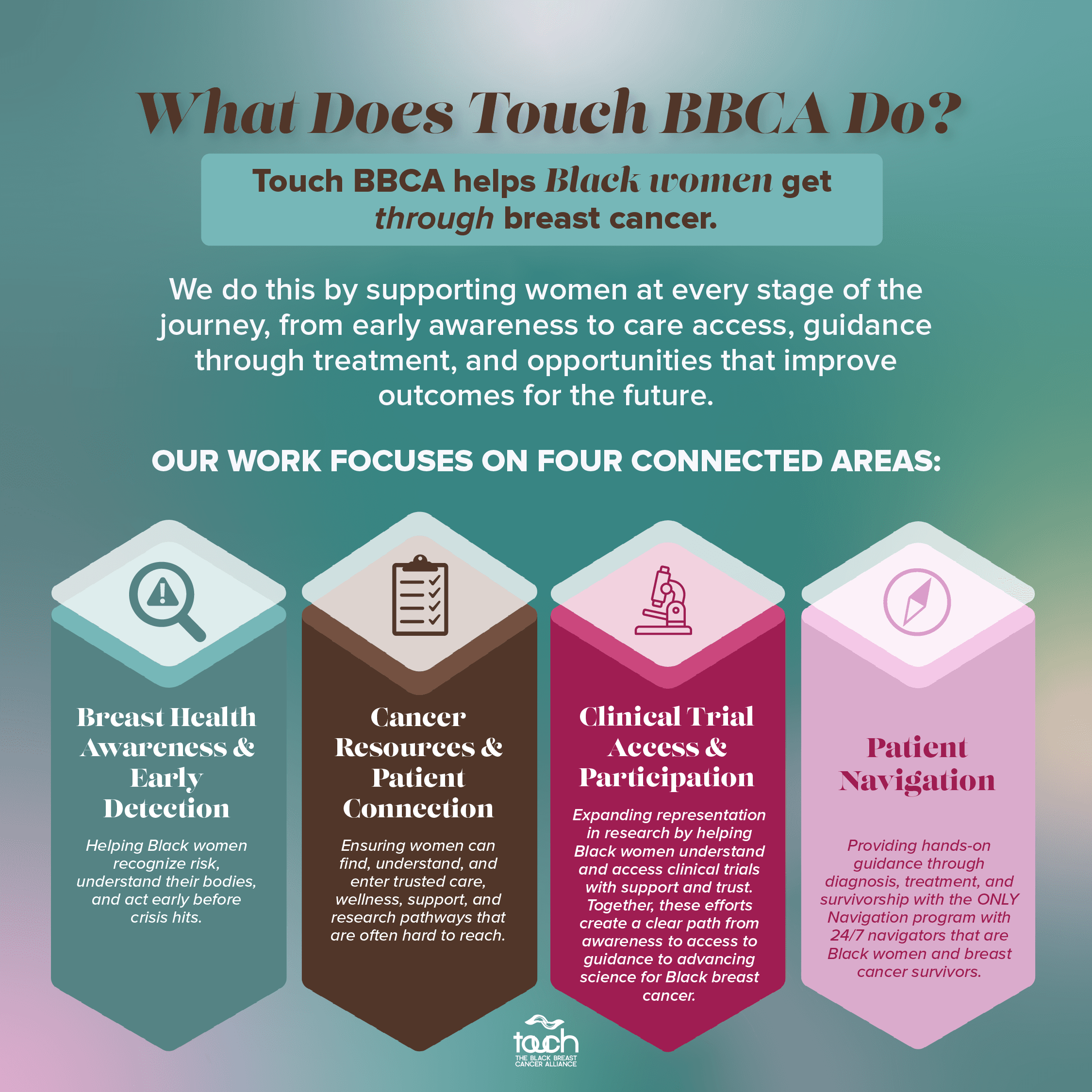 TOUCH was founded in 2020 by two Black breast cancer survivors who saw firsthand the critical need for breast cancer support and services specific to Black women. Since then, TOUCH has reached over 5 million people with programs ranging from monthly Black support groups to clinical trial education in Black communities to our HBCU Internship focused on Black Breast Health.